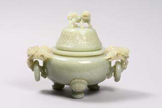 獅子鈕牡丹耳青玉香炉