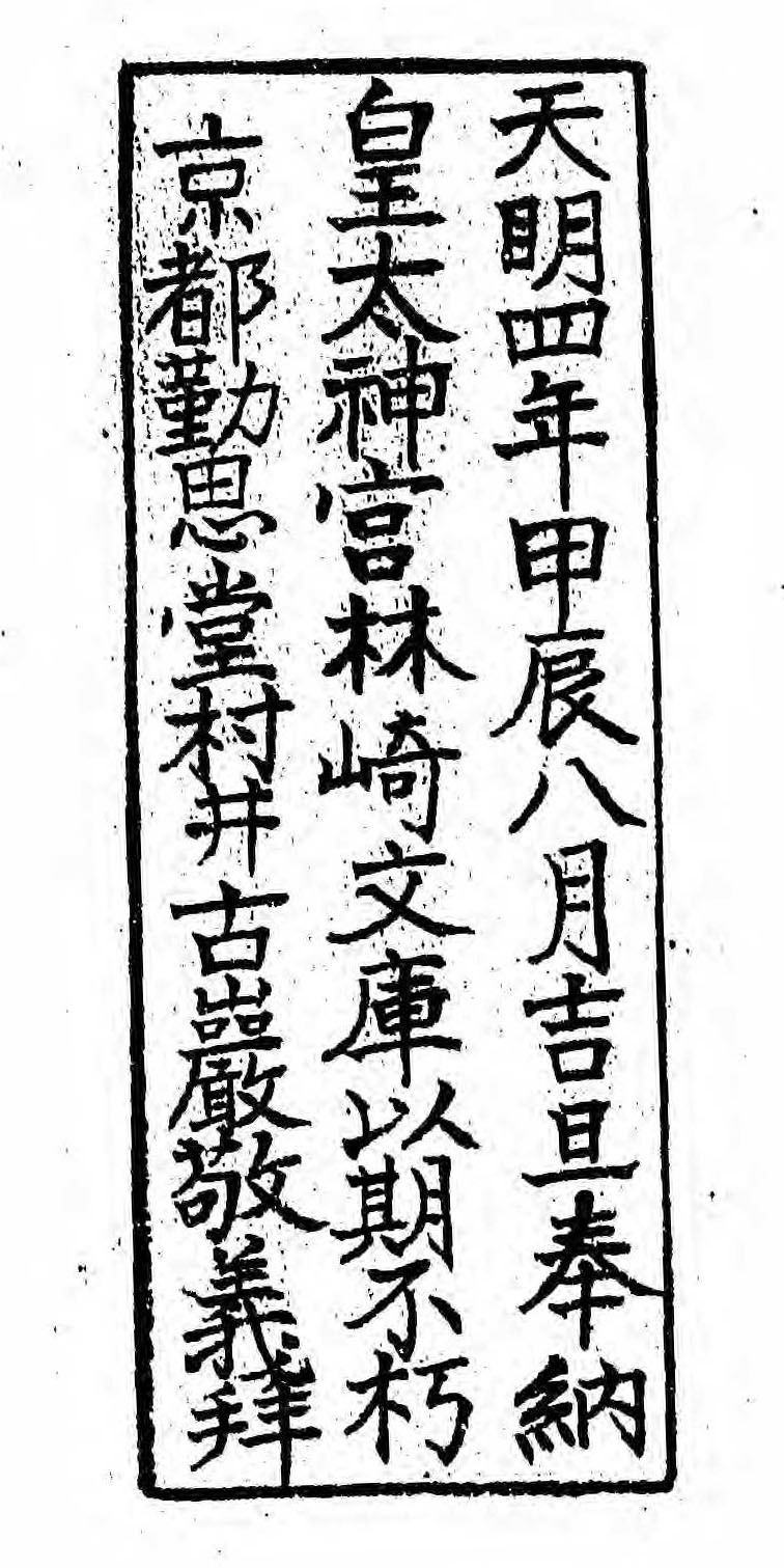 天明四年甲辰八月吉旦奉納皇太神宮林崎文庫以期不朽京都勤思堂村井古巌敬義拝