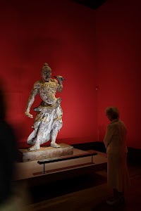 Bezoekster bekijkt een beeld van een Japanse tempelwachter