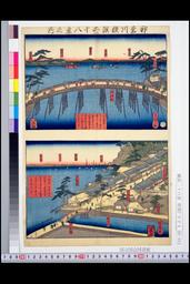 神奈川横浜二十八景之内 新田間橋ヨリつゞきて本沼橋出橋の上ヨリ神奈川新町同江戸の方へ従浦嶋観音山生麦村遠景の図ナリ此橋の下流今井川ト云/戸部村并ニ其浦先石崎橋ヨリ東海道市場鶴見の方を遠景之図此石崎橋の川を稚布川ト云