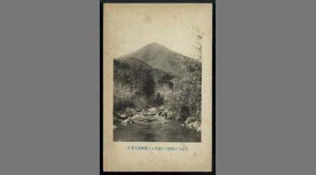 寒梅匂ふ綾部川の清流より鷹取山を望む