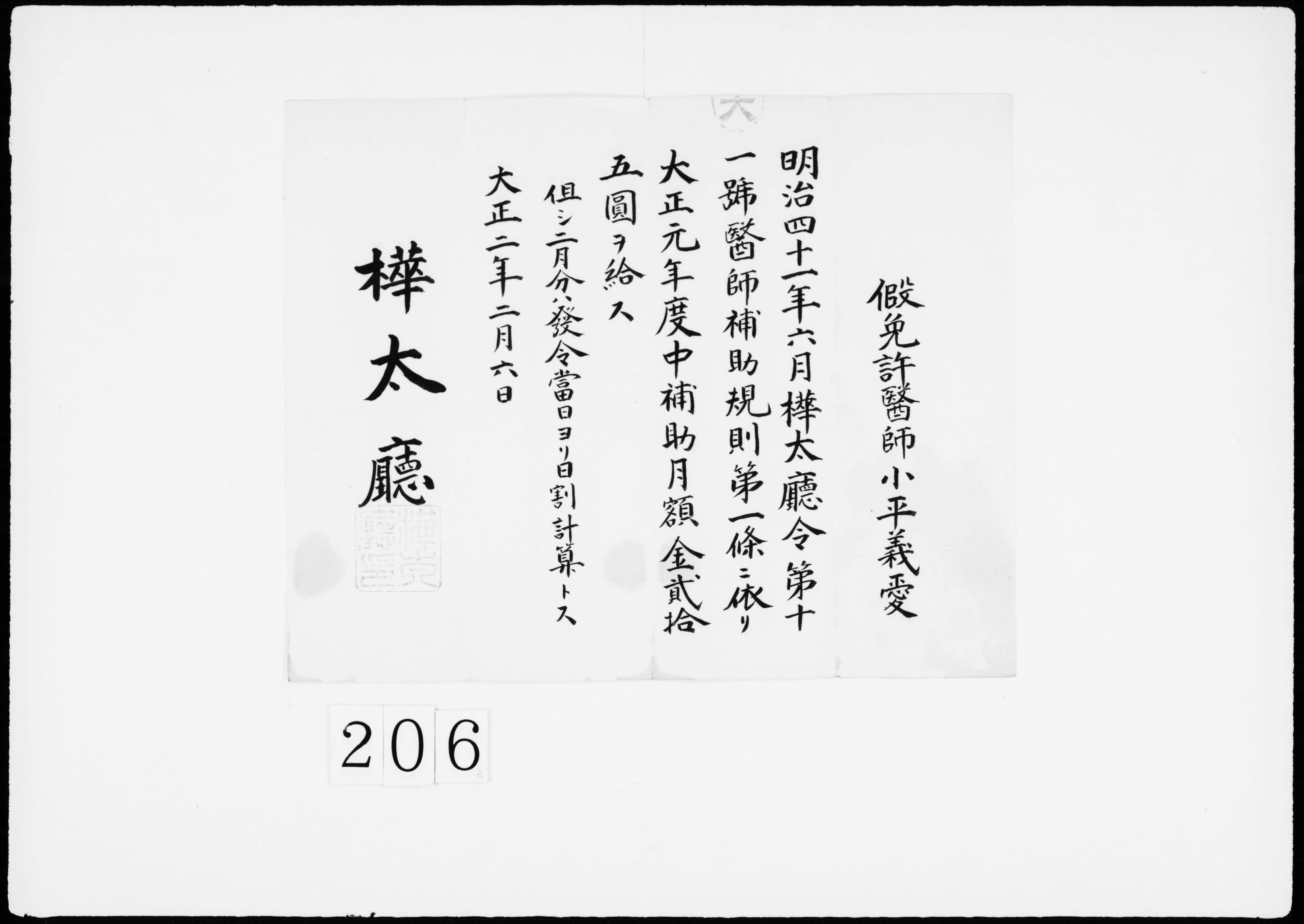 給与発令証(大正元年度仮免許医師)