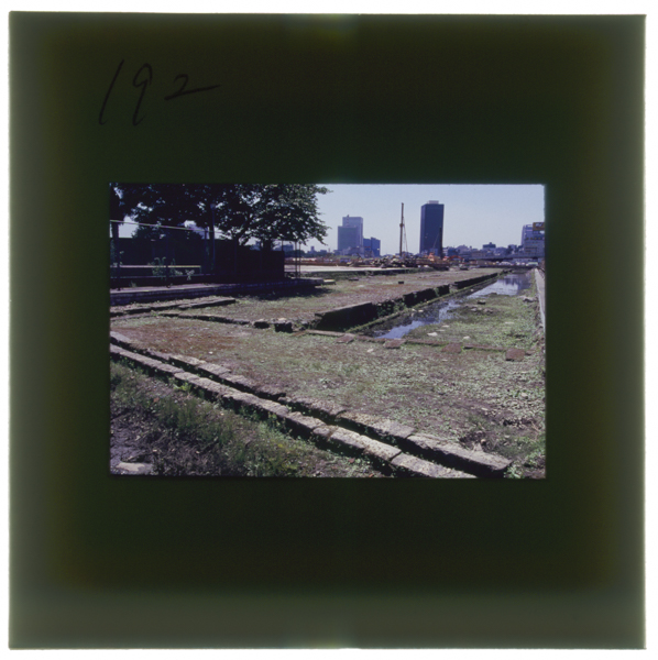 Shinbashiteishajounohōmuatonagasa144mētoruhaba9.1mētoruryouenha4dannokiriishigatsumarechuuounihahaisuikougatootteiru
