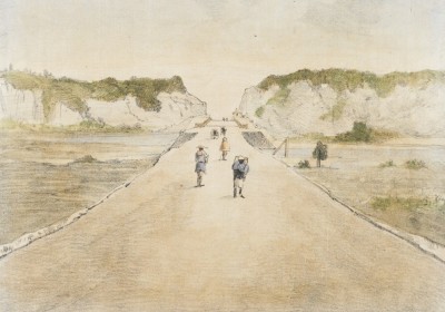 東北新道石版画 栃木県那須郡薄葉村新道ノ内帚川に架する橋梁及び切り割りを北より望む図