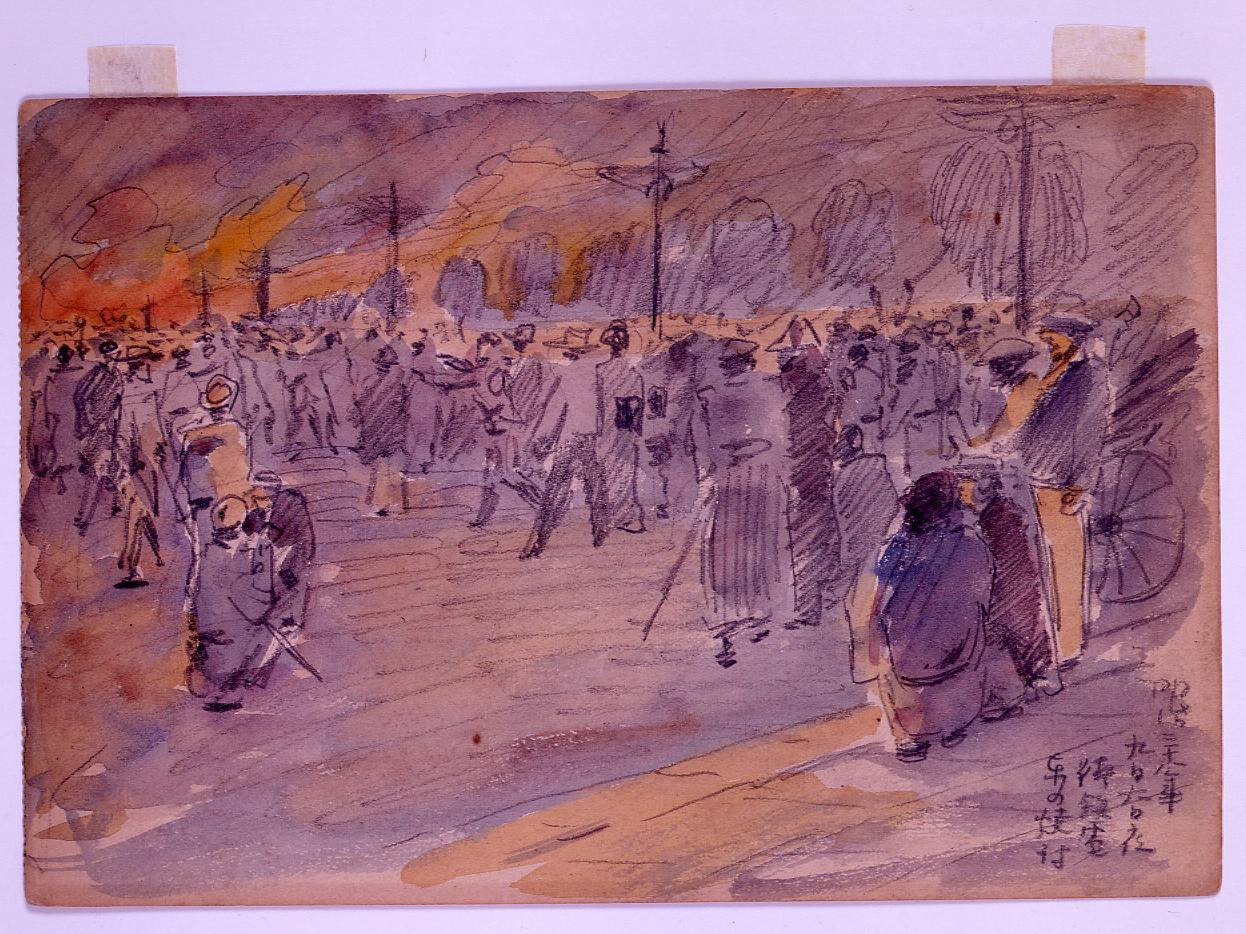 日比谷焼打事件スケッチ 明治三十八年九月六日夜写 東京市の騒擾濠端にて切られノ人