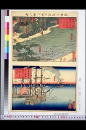 「加奈川横浜二十八景之内」 「横浜ヨリ杉山薬師之山并異人の墓天の間村を見渡ス之景色ナリ」「本牧ト横浜ノ間洋方ニ異船を見渡シ并上総千葉ノ方迄遠景」