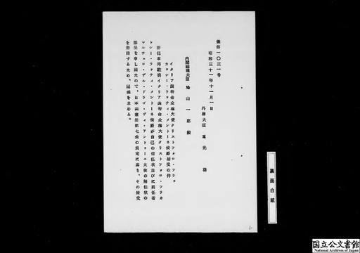 辞令(臨時特命全権公使トシテ羅馬法王宮ヘ被差遣)