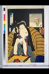 The Actor Iwai Hanshiro IV as Okumi of the Mieido Fan Shop (?) in the Play Sanjuk-koku Yobune no Hajimari (?), Performed at the Ichimura Theater (?) in the Fifth Month, 1789 (?)