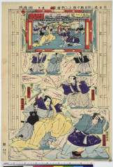 「新版当狂言尽」「伊左衛門 助高屋高助」「夕ぎり 岩井半四郎」「松永大膳 市川九蔵」「雪姫 尾上多賀之丞」「弁慶 市川団十郎」「梅川 尾上菊五郎」「忠兵衛 市川左団次」「長右衛門 片岡我童」「おはん 尾上多賀之丞」「宗清 市川団十郎」「常盤 岩井半四郎」「力弥 市川小団治」「小なみ 市川左団治」「人形づかい 尾上梅五郎」「人形づかい 坂東喜知六」「八百屋お七 尾上菊五郎」