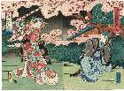 「当ル亥の弥生狂言 板元栄久堂 源平盛桜御所染 第一番目三立目 作者瀬川如皐 新清水花見の場」 「見立猿島惣太 坂東彦三郎」