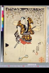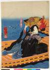 Actors in a scene from the play The Story of Cherry Blossoms on Higashiyama (Higashiyama sakura zōshi): unidentified actor as Koshimoto Kodemari, and Iwai Kumesaburō III as Ashikaga Jirō no kimi (left sheet)