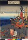 (「元暦元年十二月平将左馬頭行盛以下備前の国児島の城に立籠る 寄手三河守範頼の先徒佐々木三郎盛綱浦人の教にまかせて騎馬にて藤戸の海を乗わたす図」)