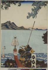 (「元暦元年十二月平将左馬頭行盛以下備前の国児島の城に立籠る 寄手三河守範頼の先徒佐々木三郎盛綱浦人の教にまかせて騎馬にて藤戸の海を乗わたす図」)