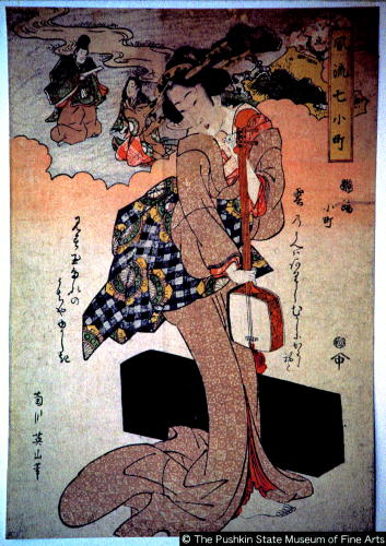 Young Woman Dressing the Hair of a Man Playing Shamisen