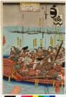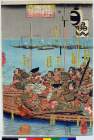 「新田左中将義貞鎌倉平高時を責んと極楽寺切通しへ押よせしが北ハ山高く南ハ稲村が崎の海渺々として進発叶ハず時に義貞龍神に祈誓し太刀一振海中へ投入玉へバ即時二十余町干潟となり軍勢勇進で戦大利を得る」 「高時の軍船」「里見五郎義留」「桃井遠江守尚義」「大館次郎宗氏」「太井田太郎経信」「堀口太郎貞持」「船田健次郎友成」「大館左馬助義明」「岩松源三郎詮家」「名張八郎貞友」「亘新左衛門康昌」「脇屋左衛門佐義助」「篠塚伊賀守貞綱」「田中飛騨守義明」「松田入道浄全」