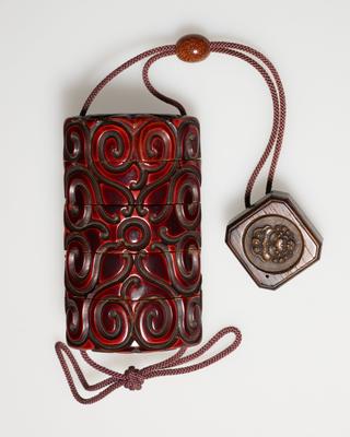 Four-case inro with carved lacquer decoration and netsuke of a box with chinese lion