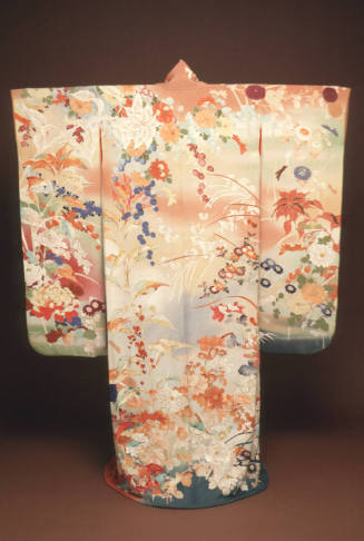 Kimono (furisode) with design of peonies, chrysanthemums, wisteria, and fans