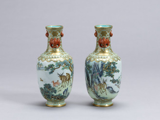 Pair of Vases with Deer and Pine Scenery; Qianlong Reign Mark Jingdezhen ware
