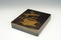 Doos van zwart metaal, versierd met landschap en bloeiende boom in lak en parelmoer