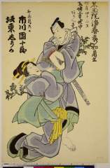 The Actors Nakamura Takesaburo I as Kewaizaka no Shosho and Ichikawa Danjuro II as Soga no Goro dressed as a komuso in the play "Bando Ichi Kotobuki Soga," performed at the Nakamura Theater in the first month, 1715