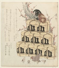 Haan op een stapel sake-vaten