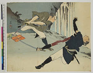 Mizushima Umon Holding Pistol by Bundle of Spears, from the series Biographies of Fine Modern Men (Kinsei Kyōgiden)