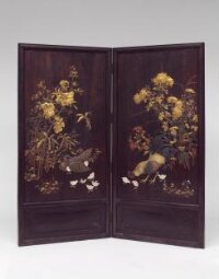 Plum branch, Susaki, courtesan, sparrows, and clothes behind screen