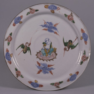 Nanking Plate with Arhat and a Pair of Cranes in Underglaze Blue and Overglaze Enamels