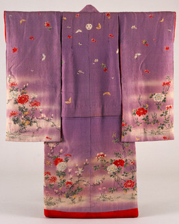 Furisode (Long-Sleeved Kimono) with Butterflies and Flowering Plants of the Four Seasons on Purple G