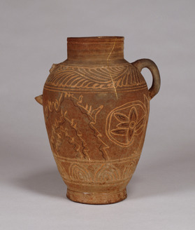 Jar with Two Handles, Ash glaze with incised pattern design