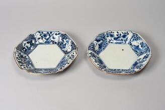 青花山水人物文角輪花皿