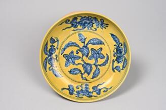 黄地青花花卉文皿