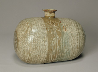 Ricebale-shaped Bottle, Buncheong ware with lotus flower in inlay and stamped chrysanthemum design
