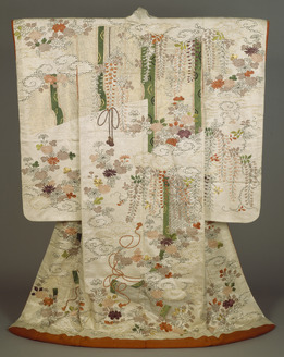 Furisode Uchikake (Long-Sleeved Outer Robe) with Bamboo Blinds, Wisteria, Chrysanthemums, Peonies, and Clouds in Dyeing and Embroidery on White Figured-Satin Ground