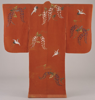 Furisode (Long-Sleeved Kimono) with Wisteria and Flying Cranes in Embroidery on Vermilion Ground
