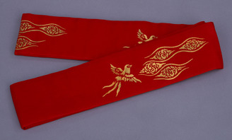 Obi (Sash) with Clouds, Vapors, and Long-Tailed Birds on Scarlet Ground