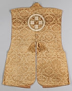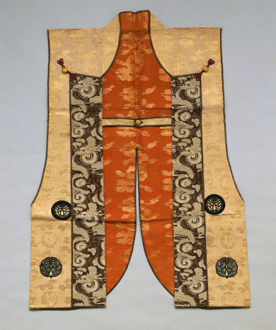 Jinbaori Coat Worn over Armor, Brocade with pine, undulating stripes, stylized plum blossom and cloud-and-dragon roundel design on brown ground