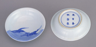 Small Dishes with Flying Cranes in Underglaze Blue (Eiraku Zengoro Ceramic Ware from the Konoike Family)