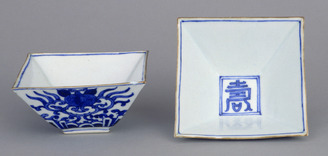 Square Mukozuke Dishes with the Character Kotobuki (Happiness) and Arabesques in Underglaze Blue (Eiraku Zengoro Ceramic Ware from the Konoike Family)