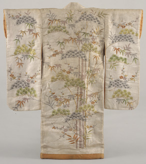 Furisode (Long-Sleeved Kimono) with Pines, Bamboo, and Plum Blossoms on White Ground