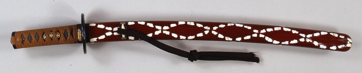 Wakizashi Style Sword Mounting with Peony-like Pattern in Lacquer Inlay on Dark Red Lacqer Ground