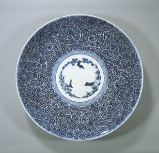 Dish, Pine, bamboo, plum tree and arabesque design in underglaze blue