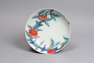 Dish, Peony and stylized wave design in overglaze enamel