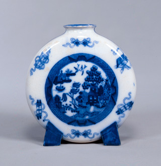 Flattened jar, Minton Ware, England, Landscape and pavillion design in underglaze blue