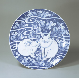 Dish, Begonia and hare design in underglaze blue