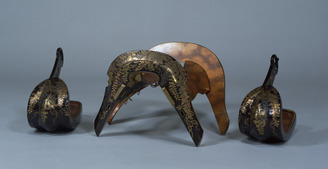 IJzeren stijgbeugel, ingelegd met gele plantenranken in sentoku en blauwgrijze slingers in shibuic...