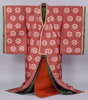 Uchiki (Woman's Semiformal Ceremonial Court Robe) with Chrysanthemum Roundels on Linked Floral Lozenges on Crimson Plum Ground