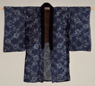 Hanten (Jacket) with Cranes, Chrysanthemums, and Well Cribs on Indigo Kasuri (Ikat) Ground