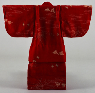 Kimono with Plovers, Chrysanthemums, and Flowing Streams on Vermilion Ground