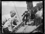 New Zealand soldiers on a ship's rope ladder in the Pacific, during World War II